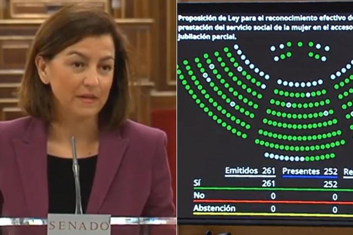 “El Senado aprueba por unanimidad que cuente como cotizado el tiempo que las mujeres dedicaron al Servicio Social del franquismo”, ha destacado en un mensaje compartido en redes sociales.