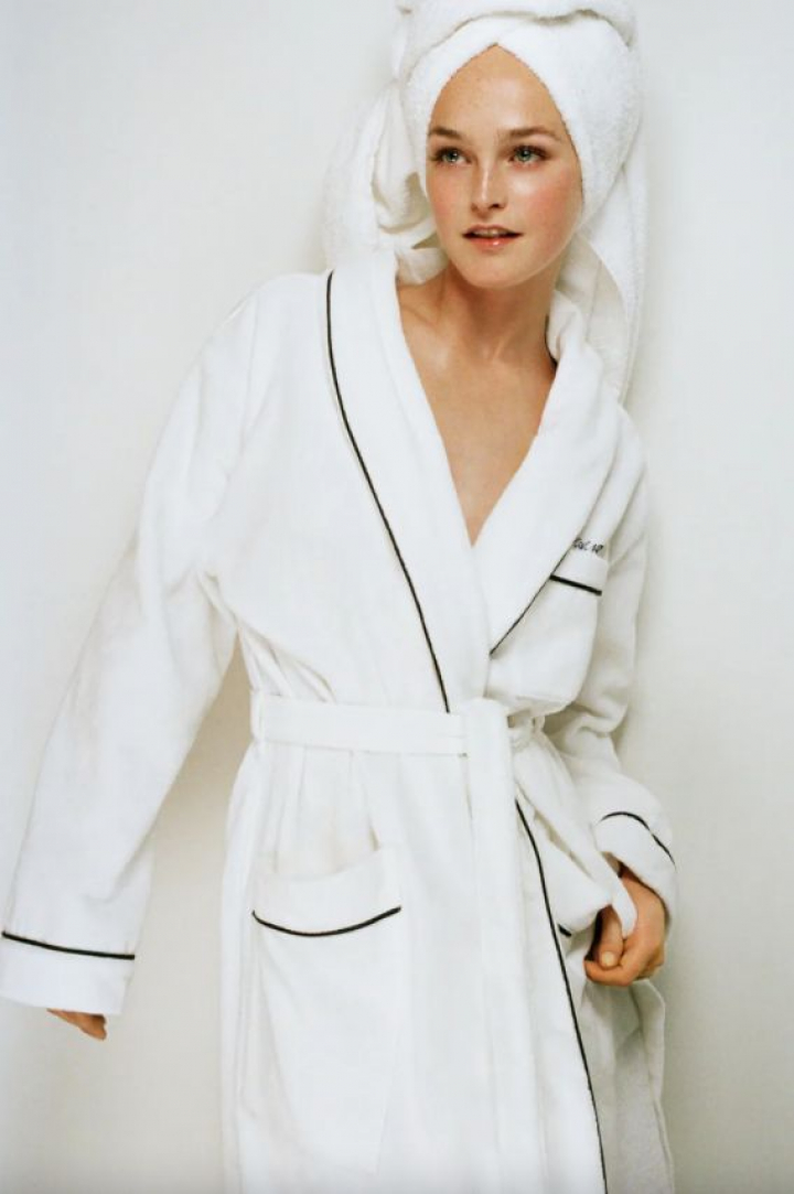 El albornoz es de corte clásico y color blanco, con un pequeño ribete negro en cuello, mangas y en los tres bolsillos que incluye. Cuesta 59,99 euros y por un euro más la marca ofrece la posibilidad de personalizarlo con nuestras iniciales o las de la persona a la que se lo queremos regalar, si ese es el motivo de la compra.