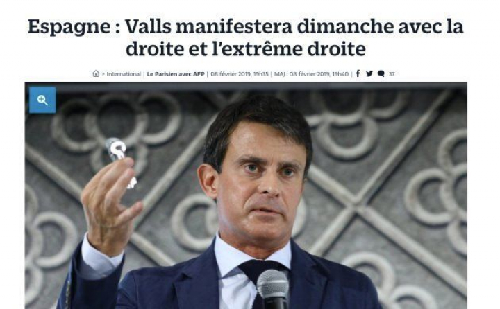 Así lo indica Le Parisien, que titula lo siguiente: "España: Valls se manifestará el domingo con la derecha y la extrema derecha".