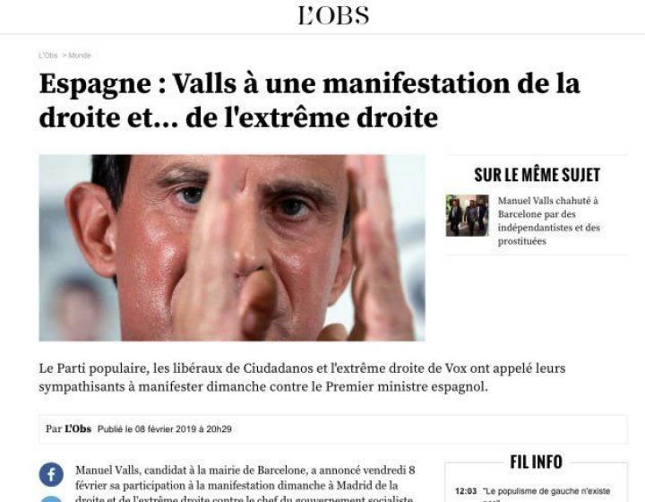 El diario L'Obs también recuerda a Valls que a la marcha irán partidos y asociaciones de extrema derecha y añaden cierta ironía en su titular: España: "Valls, en una manifestación de la derecha... y de la extrema derecha".