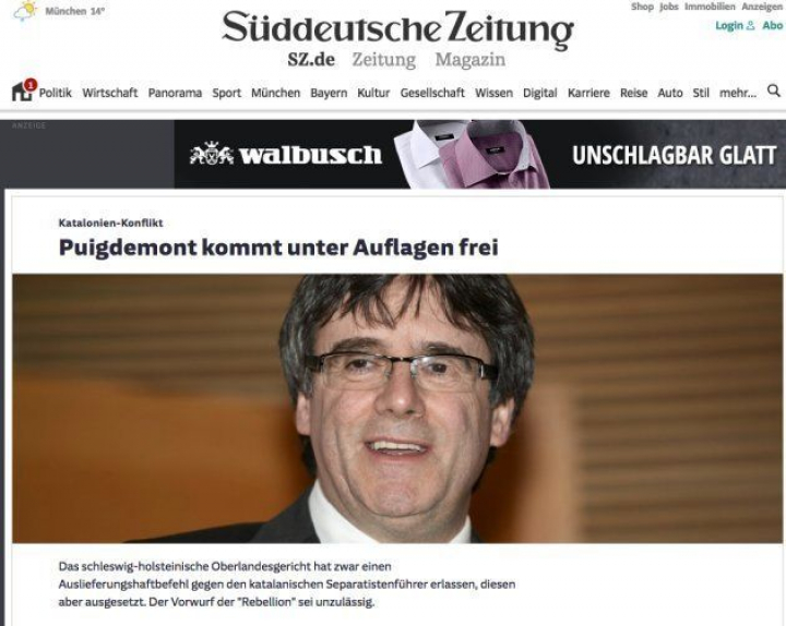 La edición digital del Süddeutsche Zeitung, uno de los periódicos más leídos de Alemania considerado el equivalente a El País y cercano al partido socialdemócrata SPD, lleva en portada como su principal noticia la liberación de Puigdemont. Puigdemont kommt unter Auflagen frei (Puigdemont es liberado bajo fianza), titula el diario con sede en Múnich, Baviera.