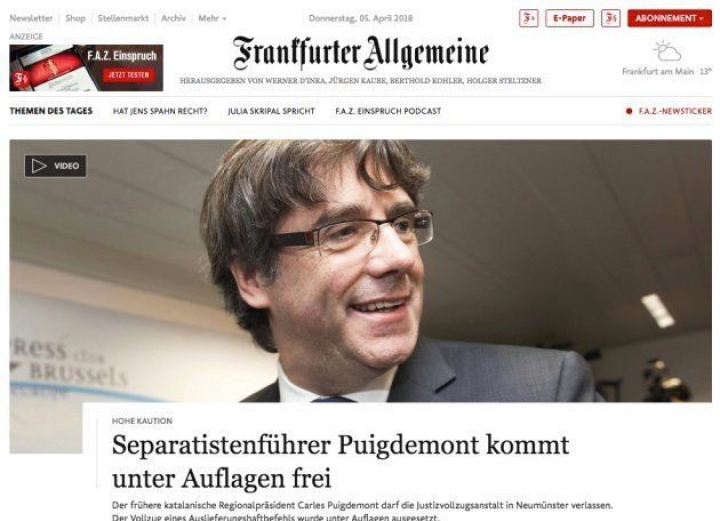 El diario conservador Frankfurter Allgemeine, principal apoyo de la canciller Angela Merkel, también lleva al expresident como la noticia más importante del día. Separatistenführer Puigdemont kommt unter Auflagen frei (El líder separatista Puigdemont liberado bajo fianza).