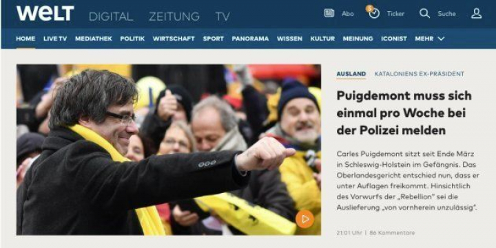 El periódico Die Welt, del conglomerado Axel Springer y similar al ABC, pone el foco sobre las medidas cautelares que pesan sobre el expresident. Puigdemont muss sich einmal pro Woche bei der Polizei melden (Puigdemont tiene que presentarse ante la policía una vez por semana).