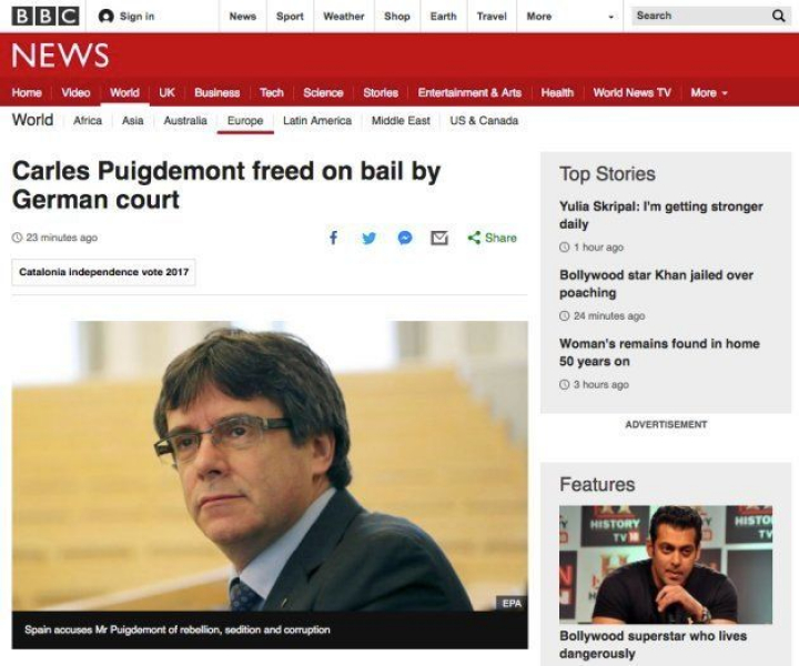 La edición digital de la televisión británica BBC titula "Carles Puigdemont es liberado bajo fianza por un tribunal alemán" y destaca que el juez haya rechazado el delito de rebelión.