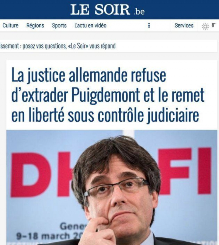 El principal diario francófono de Bélgica Le Soir, de tendencia progresista, también lleva a Puigdemont en su portada. La justice allemande refuse d'extrader Puigdemont et le remet en liberté sous contrôle judiciaire (La justicia alemana rechaza la extradición de Puigdemont y le pone en libertad bajo control judicial), titula el periódico.
