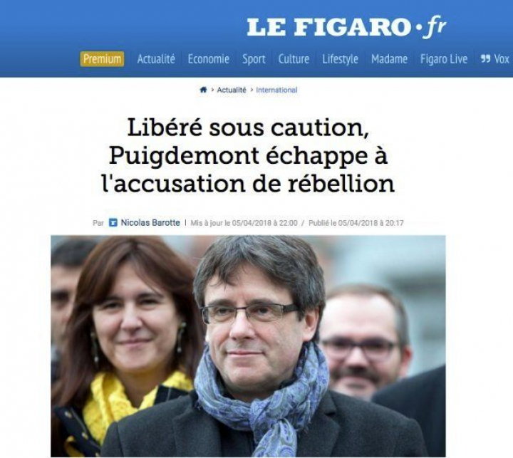 Libéré sous caution, Puigdemont échappe à l'accusation de rébellion (Liberado bajo fianza, Puigdemont escapa a la acusación de rebelión), afirma el periódico conservador Le Figaro en la noticia firmada por Nicolas Barotte.