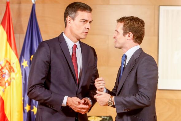 MADRID, SPAIN - JULY 09: The president of the Government, Pedro Sánchez (L), and the president of the Popular Party, Pablo Casado (R), meet at the Parliament on July 09, 2019 in Madrid, Spain. (Photo by Ricardo Rubio/Europa Press via Getty Imag...Europa Press News via Getty Images