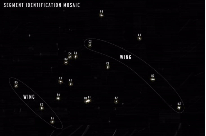 El resultado es un mosaico de imágenes de 18 puntos de luz estelar organizados al azar, el producto de los segmentos de espejo no alineados que reflejan la luz de la misma estrella en el espejo secundario de Webb y en los detectores de NIRCam. Cada punto dentro del mosaico está etiquetado por el segmento de espejo primario correspondiente que lo capturó.