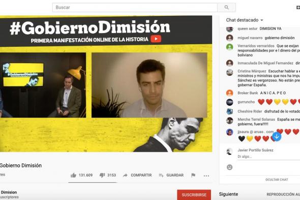 La crisis del coronavirus ha desencadenado la “primera manifestación virtual” contra el Gobierno de la historia. Aunque, en la práctica, ha sido un programa en YouTube. En la tarde de este miércoles, a las 19.00, #GobiernoDimisión ha comenzado su emisión en directo en el canal creado por comunicadores afines a Vox, y al que han animado a suscribirse a todos aquellos que quisieran secundar la ‘protesta’. “La voz de la calle ahora es la voz de las redes”, justifican en su web.
