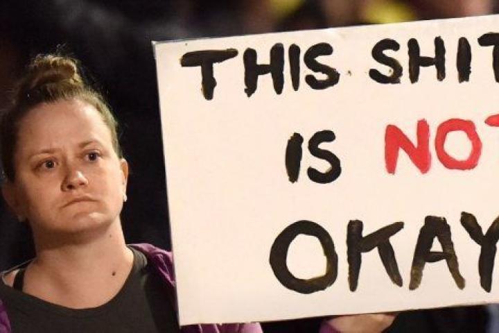 Una manifestante alza un cartel de protesta contra el racismo en Oakland en el que se lee:GETTY