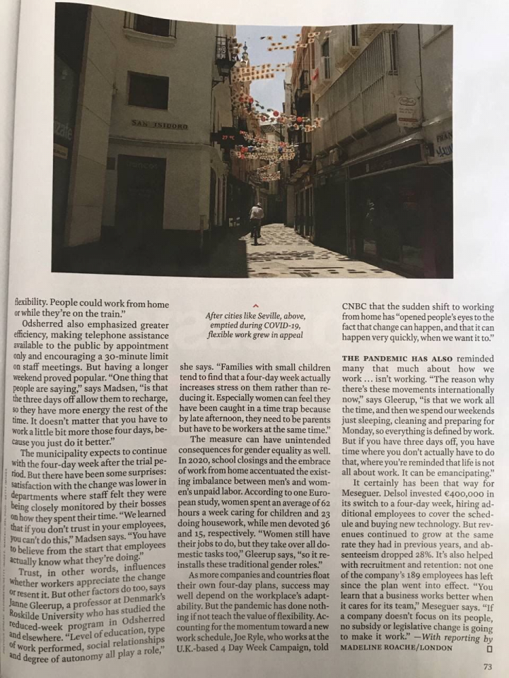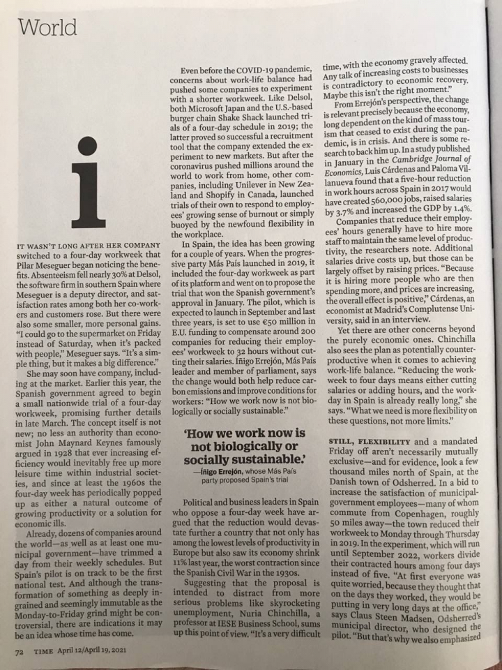 El reportaje, firmado por la periodista Lisa Abend, comienza destacando que la empresa Delsol, ubicada en Jaén. Desde el año pasado, la compañía realiza una jornada laboral de cuatro horas y, según la subdirectora de Pilar Meseguer, el absentismo empezó a disminuir, los resultados siguen siendo iguales y la satisfacción de clientes y trabajadores a aumentar.