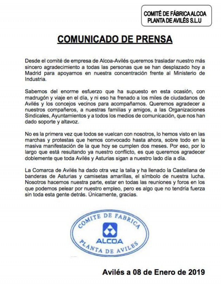 Tras el éxito de asistencia a la protesta, el comité de empresa de los trabajadores de la fábrica de Alcoa en Avilés ha emitido un comunicado este martes en torno a las 20 horas, en el que ha agradecido el apoyo de todas las personas que se han manifestado. "La Comarca de Avilés ha dado otra vez la talla y ha llenado la Castellana de banderas de Asturias y camisetas amarillas, el símbolo de nuestra lucha", ha señalado el comité.