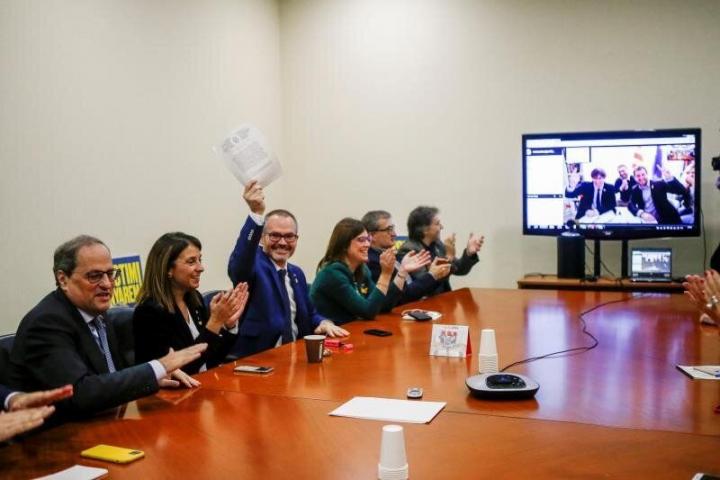La prensa ha podido ver cómo en una sala hasta la bandera los presentes en Barcelona se han conectado por videoconferencia con Bruselas, una llamada en la que estaban el presidente de la formación y expresident catalán, Carles Puigdemont, y su exconseller, Toni Comín, ambos escapados a Bélgica para eludir el juicio sobre el procés. Todos se han felicitado por el reconocimiento de que los tribunales españoles se equivocaron cuando no permitieron a Junqueras ir a recoger su acta de europarlamentario por estar en prisión y lo han mostrado a las claras con gritos como “os queremos en casa” y “Perpignan”.