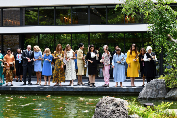 Mientras los líderes se reunían y sellaban los acuerdos que gobernarán el mundo durante los próximos años, sus mujeres (y Philip May, el marido de la primera ministra británica), daban de comer a los peces del estanque del templo Tofuku-ji en Kyoto, con Brigitte Macron y Begoña Gómez (mujer de Pedro Sánchez) en primera línea.