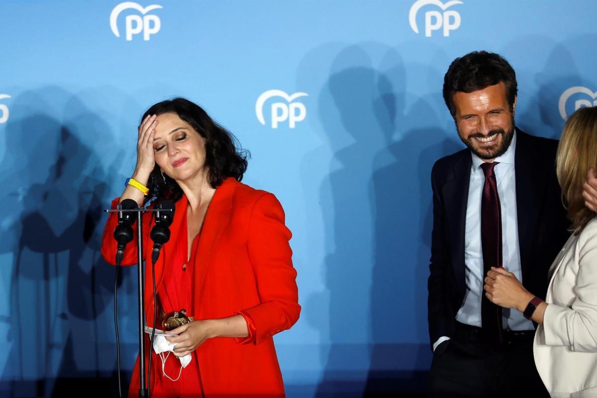La presidenta madrileña y candidata a la reelección, Isabel Díaz Ayuso, celebra su victoria en las elecciones madrileñas junto al líder del PP, Pablo CasadoEFE