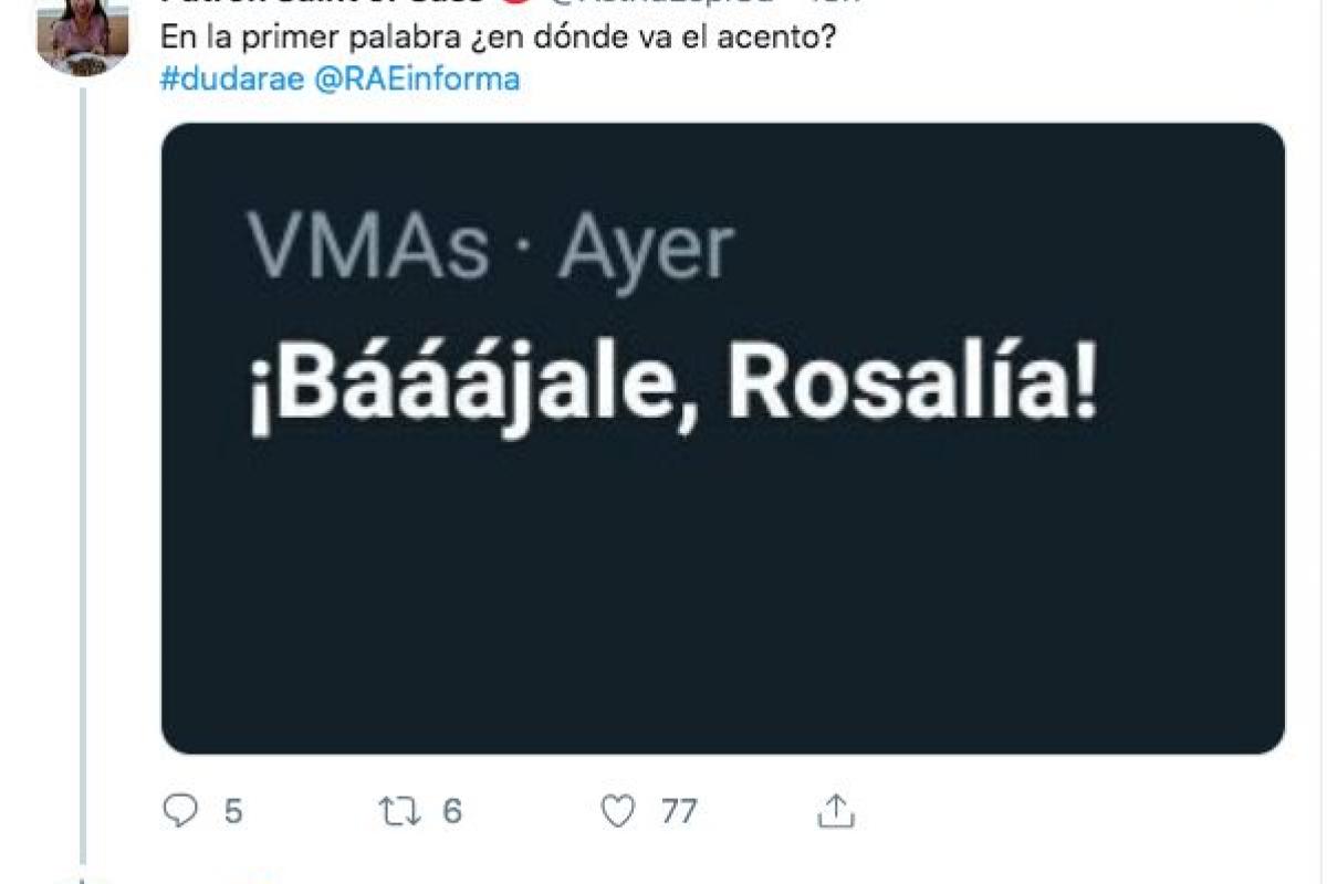 ″¡Bááájale, Rosalía”, se podía leer en la red social. Poco después, la usuaria de Twitter @AstridEspiGa hacía una una consulta a la Real Academia Española (RAE) en Twitter: “En la primera palabra ¿en dónde va el acento?”.