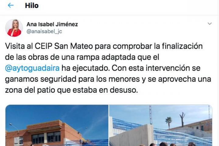 “Visita al CEIP San Mateo para comprobar la finalización de las obras de una rampa adaptada que el Ayuntamiento de Alcalá de Guadaíra ha ejecutado. Con esta intervención se ganamos seguridad para los menores y se aprovecha una zona del patio que estaba en desuso”, escribió.