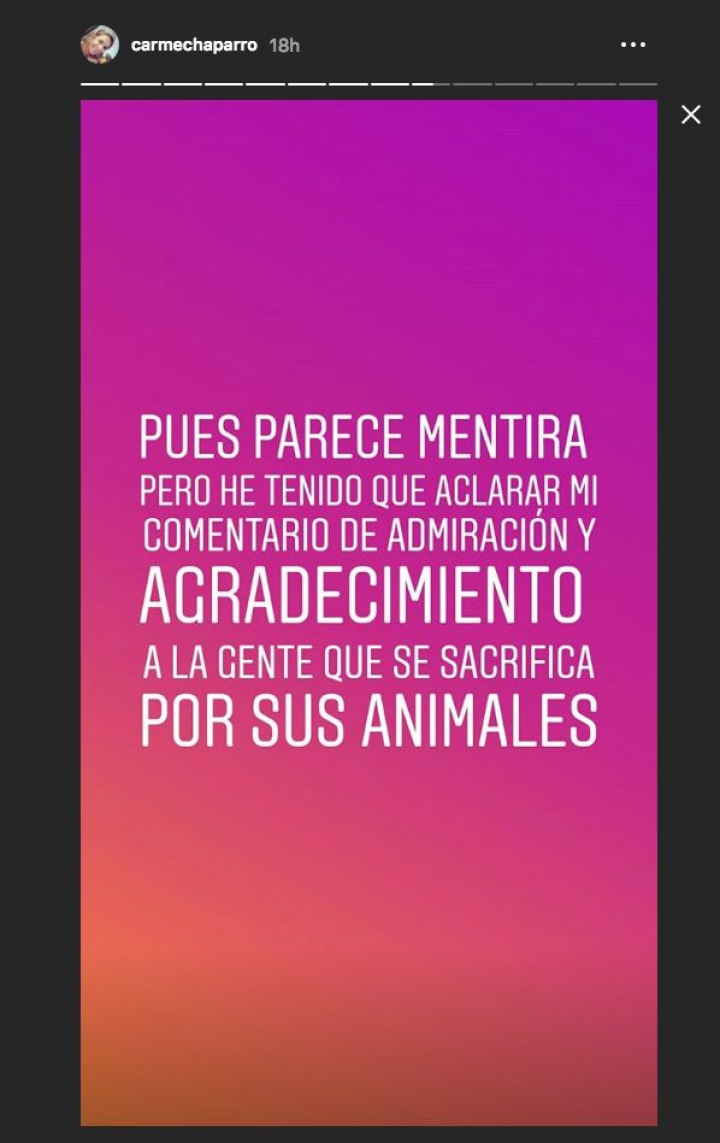 "Parece mentira, pero he tenido que aclarar mi comentario de admiración y agradecimiento a la gente que se sacrifica por sus animales", ha relatado en sus stories. A continuación, ha compartido una captura del texto que ha añadido a las fotos que compartía hace tres días.