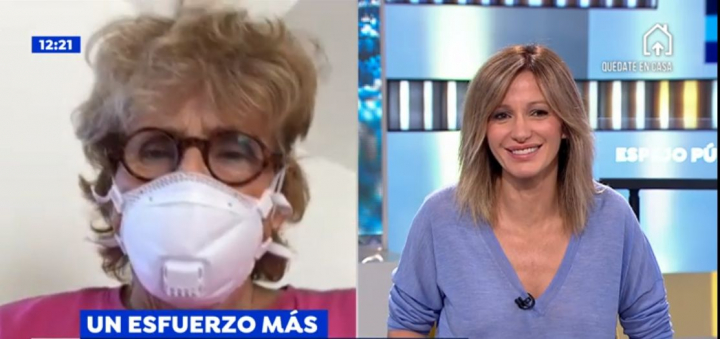 Este viernes, Griso ha llamado a la presentadora Marcedes Milá, que ha sorprendido a la conductora de Espejo Público al aparecer con una mascarilla puesta. “Uy, ¿pero tú vas con la mascarilla todo el día puesta?”, ha preguntado extrañada.