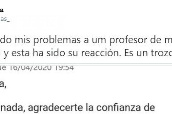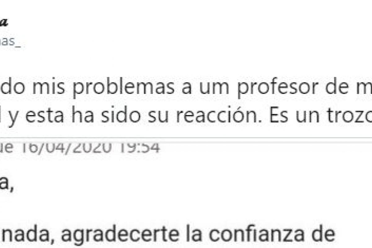 “Le he contado mis problemas a un profesor de mi Universidad y esta ha sido su reacción. Es un trozo de pan”, ha empezado diciendo la tuitera.