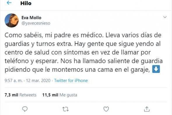 En un hilo de Twitter que acumula cerca de 8.000 retuits y 11.700 ‘me gusta’, Mollo lamenta que haya gente que siga yendo al centro de salud pese a tener síntomas. Ante esta situación, su padre ha pedido a la familia que le monten una cama en el garaje para no tener que estar en contacto con ellos.