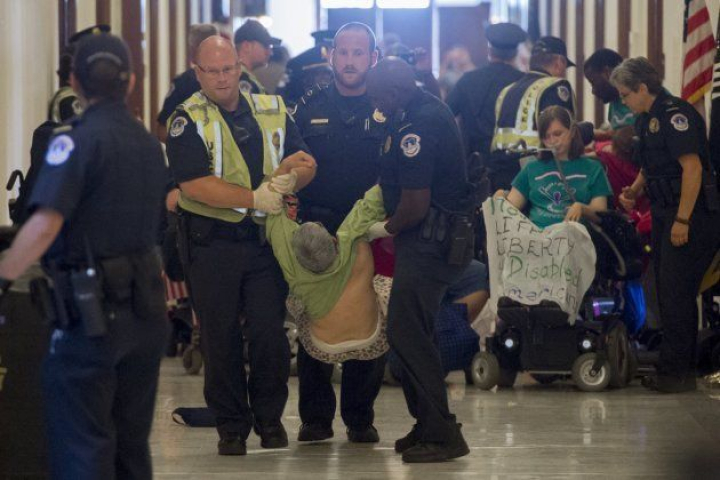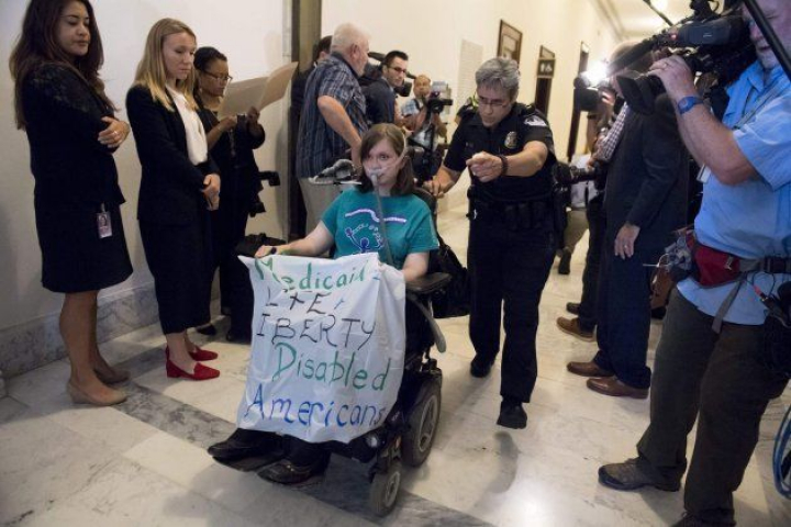 Coincidiendo con los discursos de los legisladores este jueves, se ha organizado una protesta junto a la oficina de McConnell en la que numerosas personas en sillas de ruedas bloqueaban el paso y criticaban los recortes en el Medicaid. La Policía del Capitolio acudió a la zona y retiró a los manifestantes.