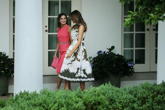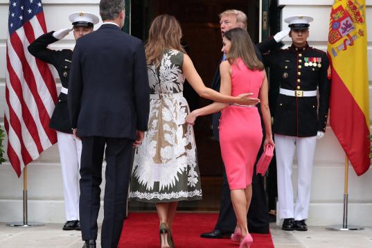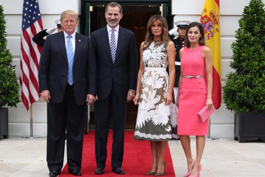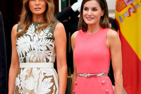 Por su parte, el look de doña Letizia ha hecho que muchos se pregunten si quiso hacerle un guiño a la primera dama. La reina optó por un diseño del estadounidense Michael Kors en rosa que precisamente Melania Trump había lucido en azul justo un año antes.
