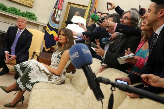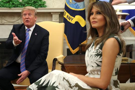 La primera dama de Estados Unidos eligió un vestido de Valentino verde con un estampado de hojas en blanco. Melania Trump le añadió un cinturón blanco para ceñirlo y unos stilettos en el mismo tono verde que el vestido.