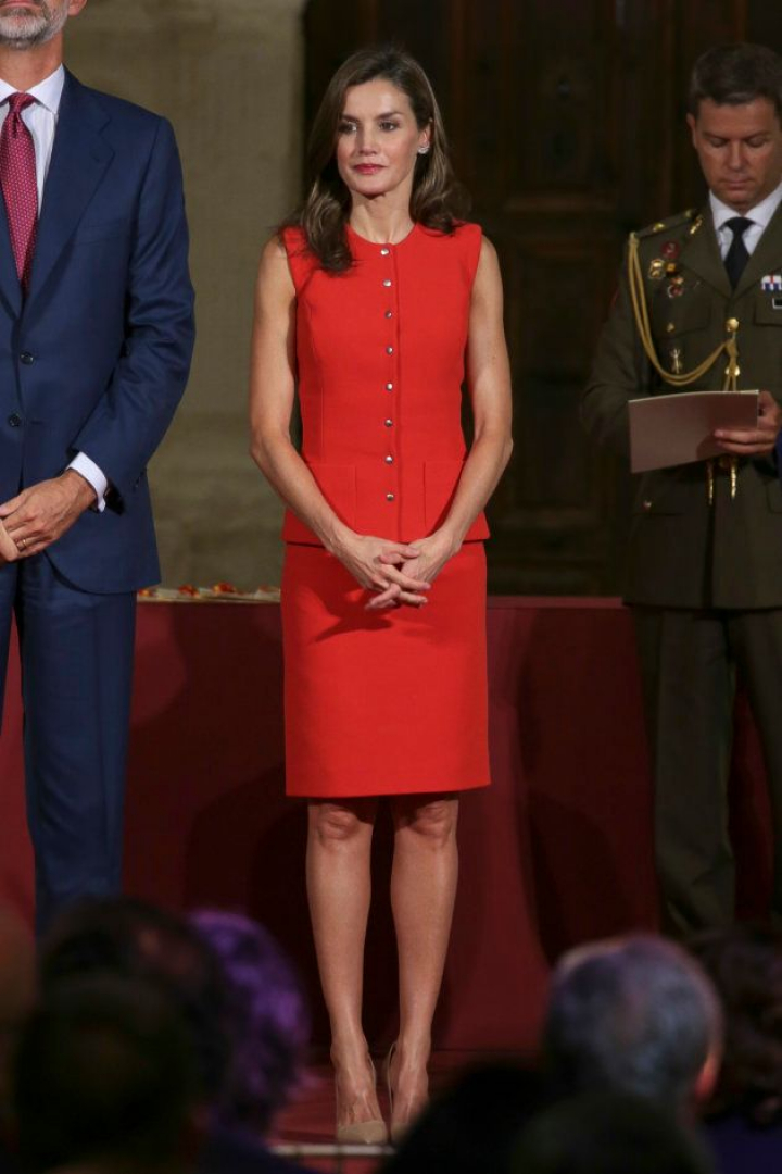 Para la ocasión, y como ya es habitual, todas las miradas han recaído en doña Letizia. La reina de España ha usado esta ocasión para contar cosas con su ropa y sus gestos, como es habitual. Para empezar, con el color: la reina ha usado el que es su tono fetiche, el rojo. Es el que mejor le queda, el que más le favorece y el que usa para las ocasiones especiales, como ella misma sabe. En concreto, se ha decantado por un dos piezas de Nina Ricci que estrenó en el viaje oficial a París, en junio de 2015.
