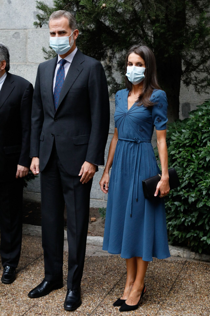 Se trata de un sencillo y bonito vestido azul de la firma italiana Bottega Veneta, con un escote en V y una fina cinta que marca la cintura y parece hecho a medida para la monarca.