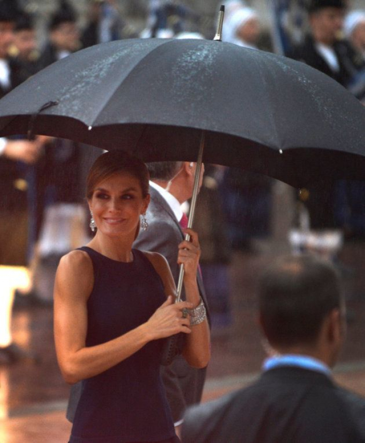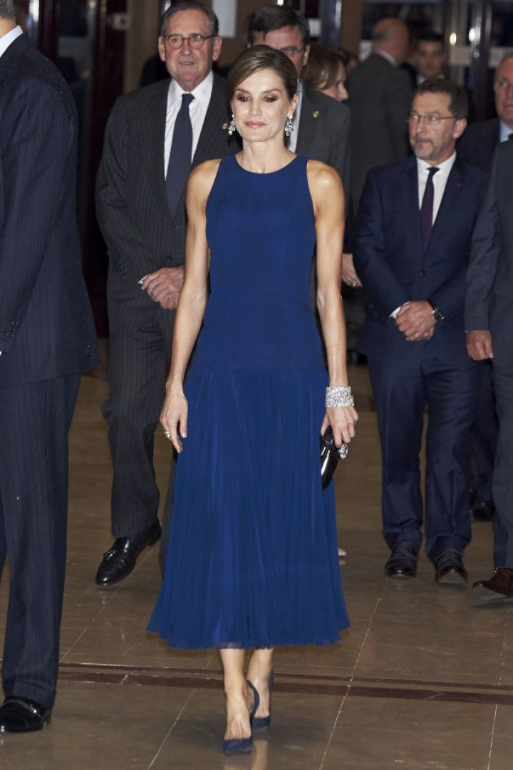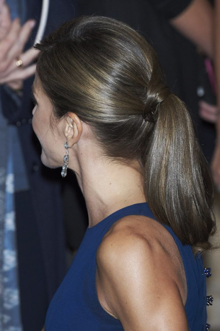 El vestido azul con el que la reina lució músculo, como dice el Daily Mail, es una creación de su diseñador de cabecera para este tipo de eventos: Felipe Varela. "Y llevó el pelo peinado hacia atrás en un elegante recogido", apunta el texto.