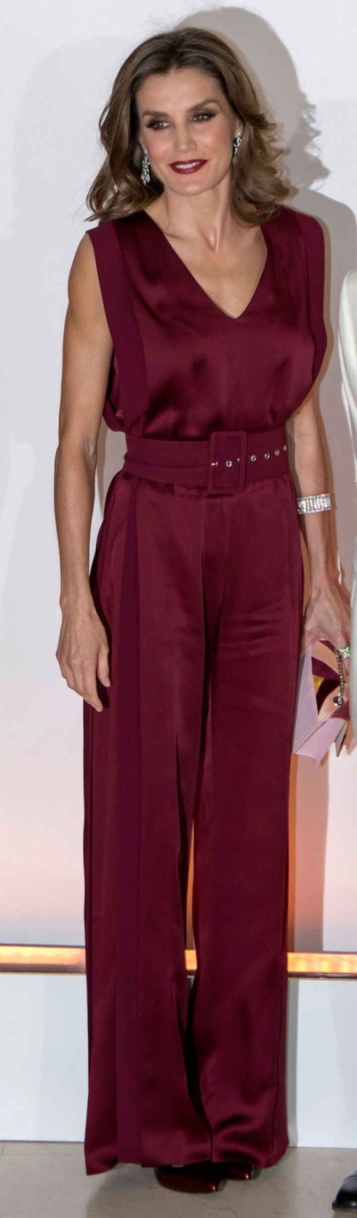 Concretamente, la periodista y la experiodista han coincidido con un mono, un diseño de pantalón largo sin mangas en color burdeos de Ángel Schlesser que cuesta 430 euros. La reina lo llevó el pasado 26 de octubre en los premios Mariano de Cavia que otorga el diario ABC, una de sus citas favoritas y en la que siempre llama la atención por el conjunto elegido.