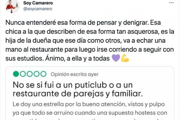 “Nunca entenderé esa forma de pensar y denigrar. Esa chica a la que describen de esa forma tan asquerosa, es la hija de la dueña que ese día como otros, va a echar una mano al restaurante para luego irse corriendo a seguir con sus estudios. Ánimo, a ella y a todas”, ha escrito el autor de la publicación en Twitter.
