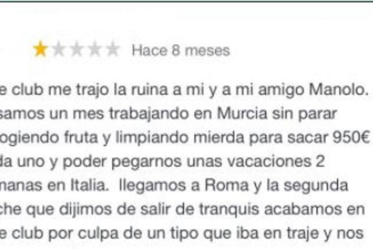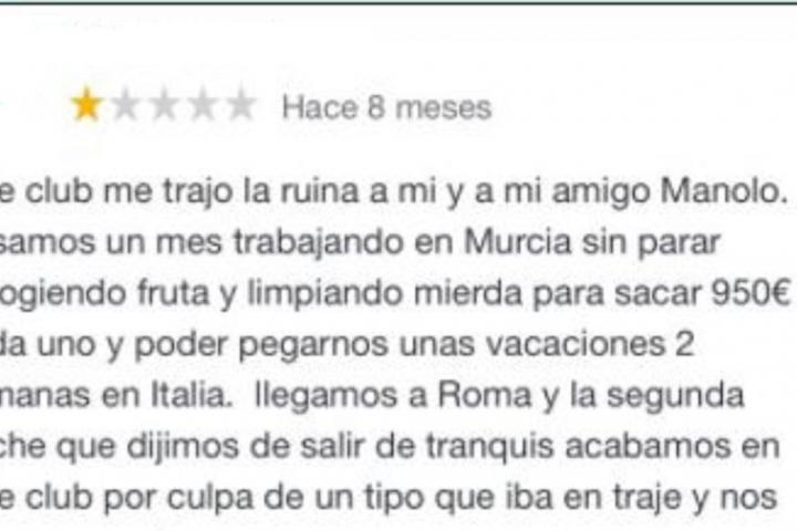 En su mensaje, el hombre se queja del trato que recibió en el Poppea Club de Roma, que, según dice, le trajo la ruina tanto a él como a su amigo Manolo. Según el relato del cliente, ambos habían ido a Italia dos semanas de vacaciones tras pasarse un mes trabajando en Murcia “recogiendo fruta y limpiando mierda” para poder ganar 950 euros cada uno.
