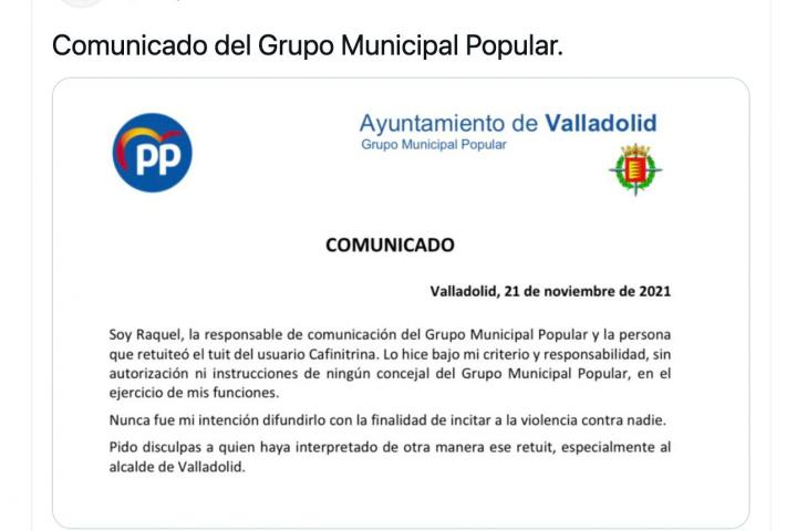 La responsable del tuit del PP sobre el alcalde de Valladolid pide perdón en un comunicado