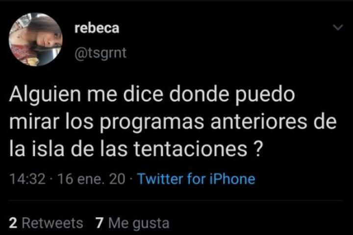 ″¿Alguien me dice dónde puedo mirar los programas anteriores de La isla de la tentaciones?”, ha preguntado. “En Mitele seguramente estén”, le ha respondido amablemente otro tuitero en referencia a la aplicación de Mediaset para ver todos lo que se emite en sus distintos canales.