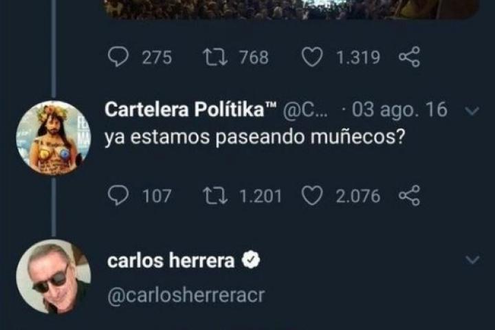 A ese mensaje respondió un usuario, que tras el alboroto que se formó borró el tuit: ”¿Ya estamos paseando muñecos?”. La respuesta del presentador de la Cope es historia: “Paseando a tu puta madre”.