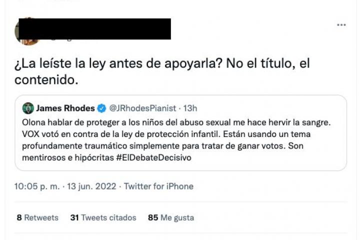 “Olona hablar de proteger a los niños del abuso sexual me hace hervir la sangre”, escribió Rhodes antes de recordar que “Vox votó en contra de la ley de protección infantil”.