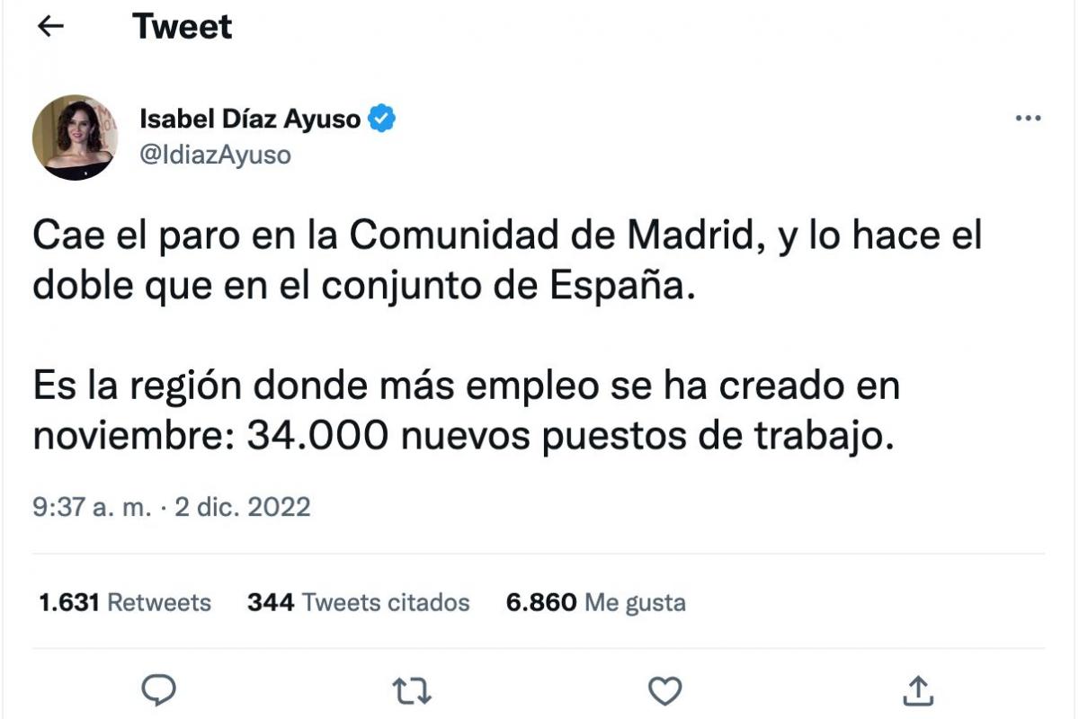 Sobre esto ha afirmado Ayuso: “Cae el paro en la Comunidad de Madrid, y lo hace el doble que en el conjunto de España.Cae el paro en la Comunidad de Madrid, y lo hace el doble que en el conjunto de España.