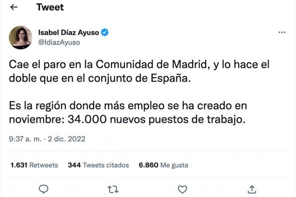 Sobre esto ha afirmado Ayuso: “Cae el paro en la Comunidad de Madrid, y lo hace el doble que en el conjunto de España.Cae el paro en la Comunidad de Madrid, y lo hace el doble que en el conjunto de España.