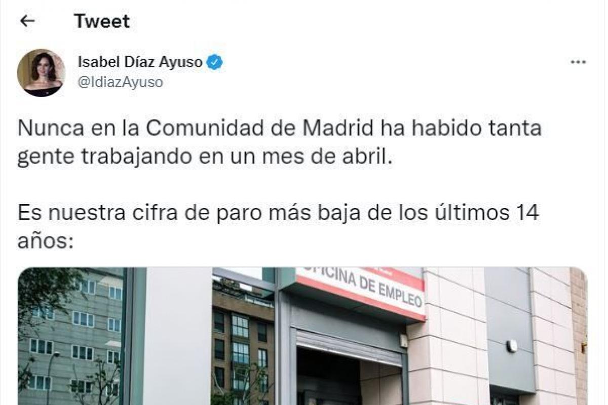 “Nunca en la Comunidad de Madrid ha habido tanta gente trabajando en un mes de abril. Es nuestra cifra de paro más baja de los últimos 14 años”, ha escrito la dirigente del PP.