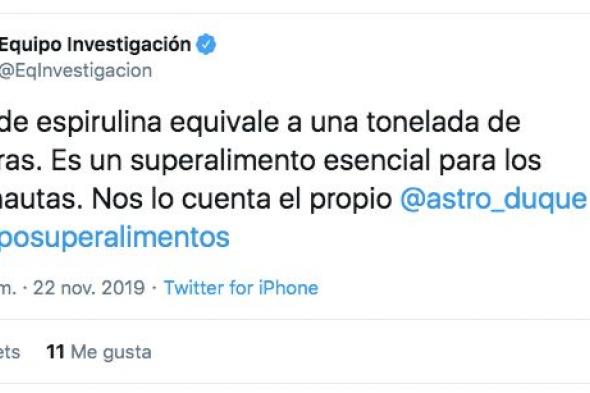 Sin embargo, a Duque no le ha hecho tanta gracia el mensaje en Twitter con el que el programa ha promocionado sus explicaciones: “1 kilo de espirulina equivale a una tonelada de verduras. Es un superalimento esencial para los astronautas. Nos lo cuenta el propio Pedro Duque”.