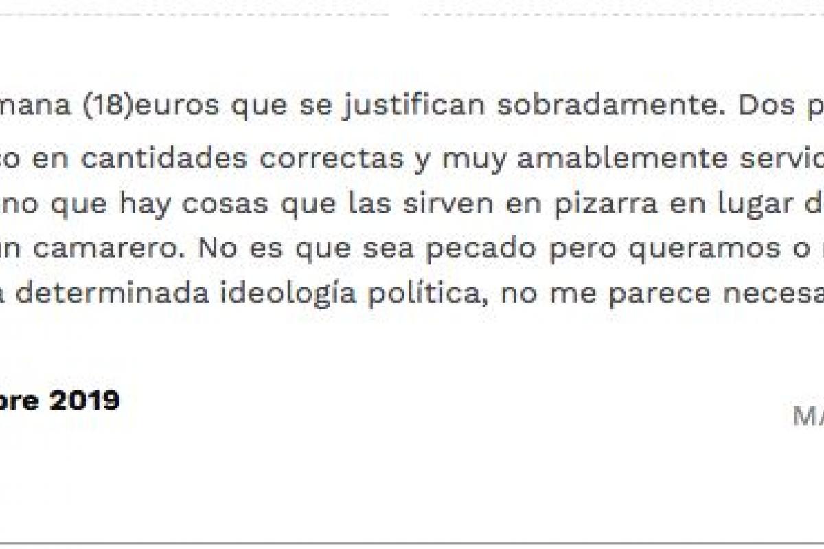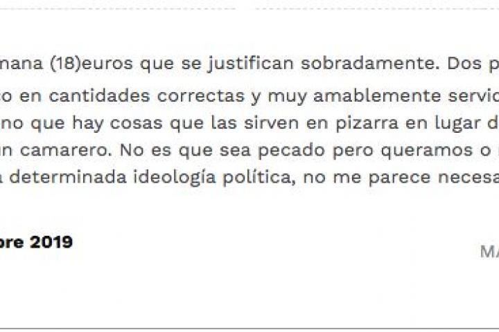 “He comido menú de semana (18) euros que se justifican sobradamente. Dos primeros y dos segundos a cuál más rico en cantidades correctas y muy amablemente servidos”, decía en noviembre un usuario de TripAdvisor.