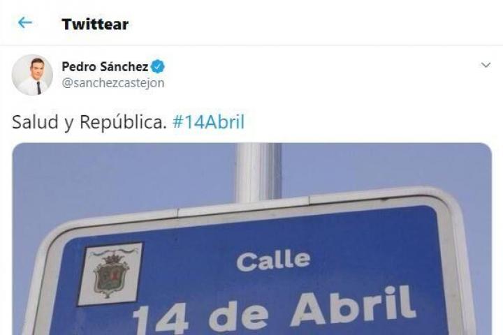 Sánchez publicó ese mensaje el 14 de abril de 2014, coincidiendo con el aniversario de la proclamación de la Segunda República, y cuando todavía no era líder del PSOE, simplemente un diputado más.