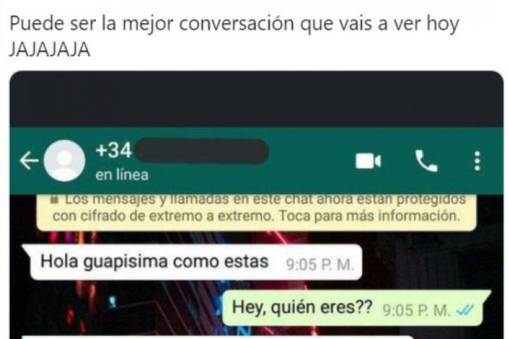 En esta conversación, que ella misma ha calificado como “la mejor que vais a ver hoy”, todo empieza con el mensaje de un hombre a una mujer. “Hola guapísima cómo estás”, dice él.