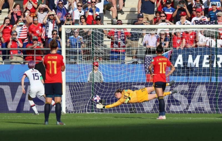 Esta vez les sirvió para situarse 1-0 después de que Leila Ouahabi dejara un pasillo a Tobin Heath. Mapi León acudió a la ayuda e hizo penal. Rapinoe engañó a Sandra Paños.