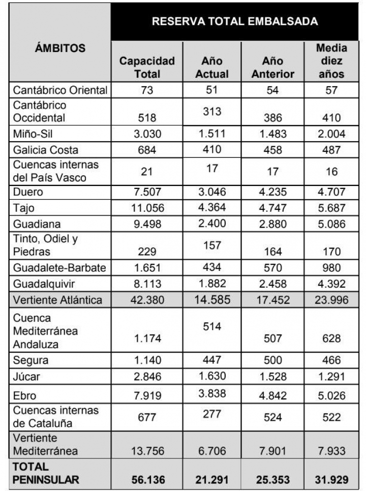 Mientras, ocho cuencas hidrográficas guardan menos agua que lo que permite la mitad de su capacidad. Son los embalses de las cuencas del Duero, que está al 40,6%; Tajo, al 39,5%; Guadiana, al 25,3%; Guadalete-Barbate, al 26,3%; Guadalquivir, al 23,2%; la cuenca Mediterránea Andaluza, al 43,8%; Segura, al 39,2% y las cuencas internas de Cataluña, al 40,9%.