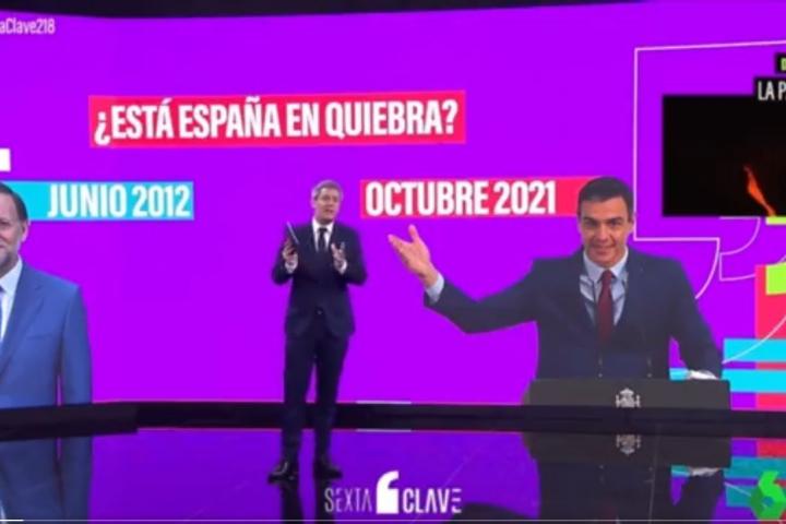 Por ejemplo, el déficit será este año del 7,6%, mientras que en 2012 era superior: del 10,7%. Más contundente aún es la comparación de la prima de riesgo, que con Rajoy llegó a alcanzar los 491 puntos. Ahora es de 63. “Hoy para los inversores España no es un problema”, asegura el presentador.