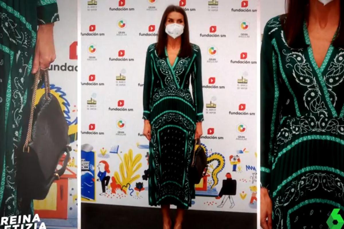 La monarca eligió, como describieron en el programa, un vestido camisero verde estampado con un pañuelo de Sandro que ya se había puesto en dos ocasiones.