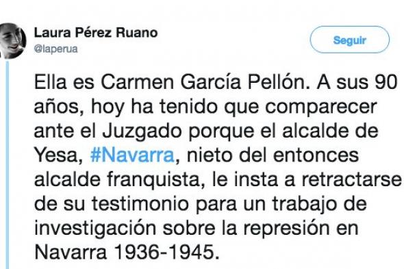 La parlamentaria foral de Oraín bai-Ahora sí Laura Pérez Ruano (@laperua) ha compartido en Twitter la historia de Carmen García Pellón, una señora de 90 años que tuvo que comparecer este miércoles en el juzgado de guardia de Yesa (Navarra) junto a Roberto Martínez, el alcalde del municipio.